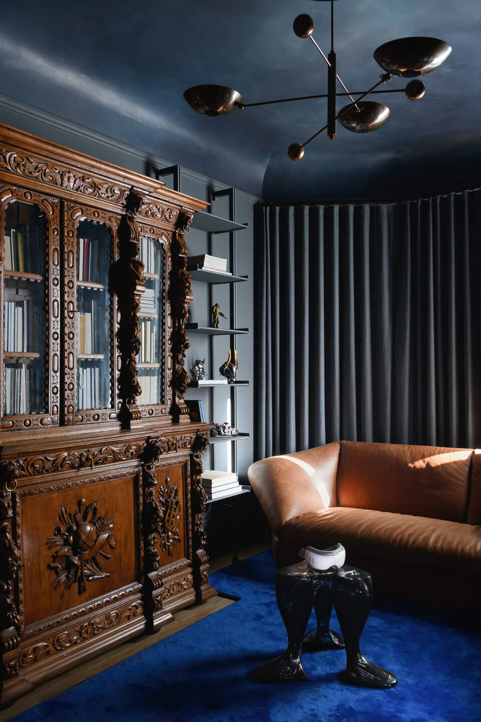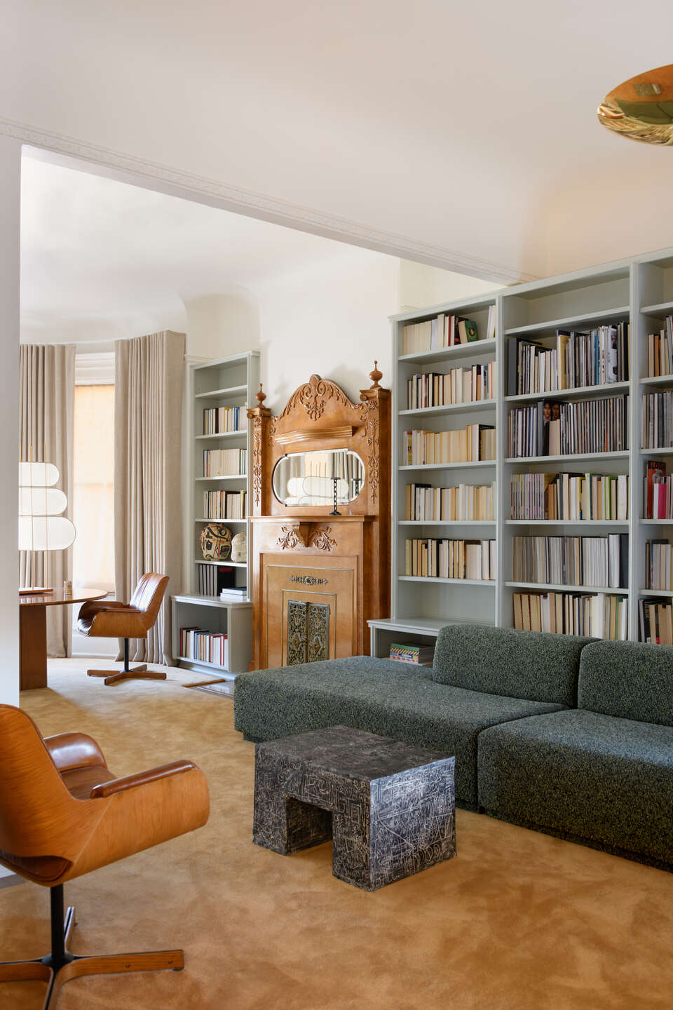 The primary bedroom is in what was once the attic, so had some strange spatial layouts. We custom-made a headboard to fill the room’s negative space, and designed a rug to connect an awkward alcove—perfect for reading—with the mainpartof the room. Greens, browns, and sand tones comprise the color scheme, evokingDune or Endor. Of note are two space age lamps by Pierre Cardin and Mario Bellini; and several insectoid pieces: a sculpture (JugglBug) by Nick Taylor, a chair by Sara Bond, and a rope-covered dresser made by Christian Astuguevieille, the underrated whimsical sensualist.